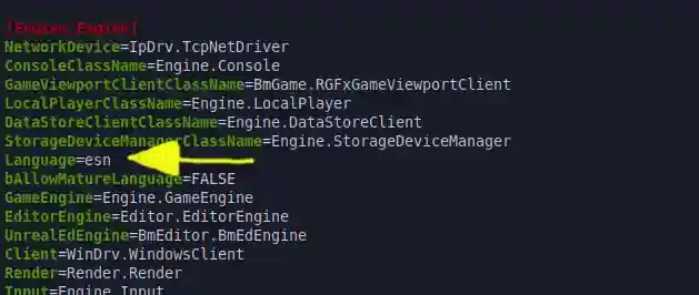 Primero abrimos el llamado UserEngine.ini con un procesador de textos como Gedit, Vim, XED…. Una vez abierto, buscamos la línea Language y la dejamos así: