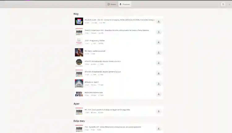 También nos puede mostrar la lista de los podcast por episodios, ordenador por días. Simplemente tenemos que pulsar el botón de arriba titulado «Nuevo»