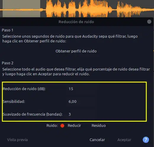 Si no lo estamos, modificamos los valores de Reducción de Ruido (dB), aumentándolos un poco y volvemos hacer la Vista Previa y repetimos hasta estar satisfechos.