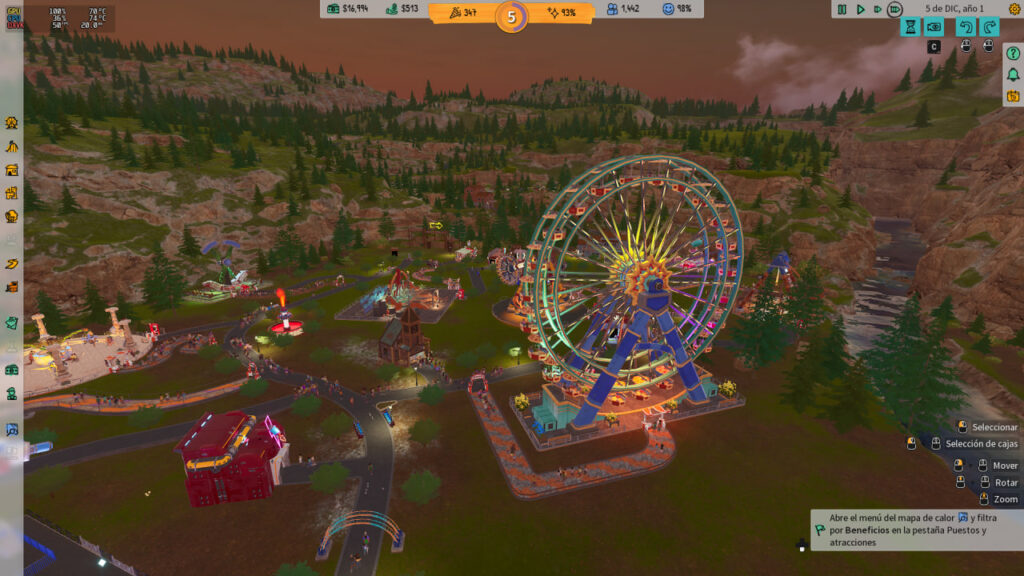 Para mi sorpresa, seguía con el tutorial. Tenía libertad para «crear», pero iba dirigido según me iba diciendo. Me obligaba a poner un mínimo de 4 bancos, vigilar el mapa de calor de las familias, montar atracciones acordes al grupo familiar, 4 animadores…. una falsa libertad, ya que si no cumples, no hay más opciones de construcción… y son realmente pocas.