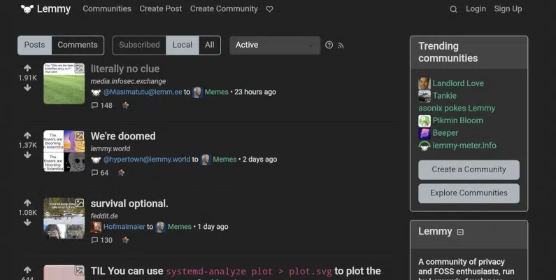Lemmy se define como un agregador de enlaces y podríamos definirlo como un foro de debate modernizado en el fediverso. Se dividen en comunidades por intereses, federadas, y también por instancias públicas o privadas, siempre gratuita y abierta. No está controlada por ninguna empresa. Esto significa que no hay publicidad, seguimiento o algoritmos secretos.