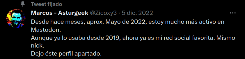 En 2022, tirado en la cama con mi lesión de espalda, leí que el cliente oficial de Mastodon para Android fué liberado. Rápidamente fuí a instalarlo en mi teléfono, logueé mi cuenta y se abrió algo «nuevo» delante de mí. Había más vida, muchas cuentas en castellano, mucha interacción…. y ahí me quedé.