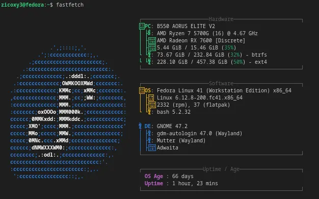 Como decía, el programa FastFetch, heredero de Neofetch, muestra, a través de nuestra terminal, las características de tu equipo, el SO, la ram, los hhdd en sus diferentes formas, la ram y un sinfin de información más… Y obviamente se puede editar con su manual.