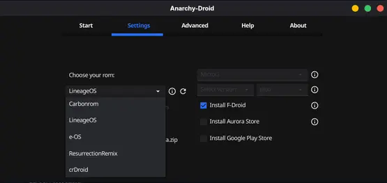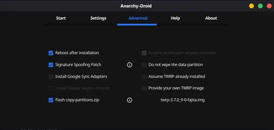 No hay mucho más que elegir. La pestaña Advanced tiene opciones que vienen marcadas o no por defecto, como reiniciar el teléfono despues de la instalación o instalar un recovery aparte… es cosa de ir conociendo antes de meterse a ello.